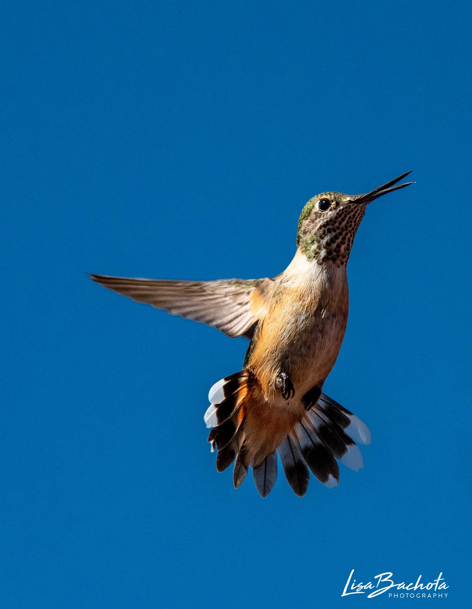 But truly one of the most remarkable experiences I have enjoyed was a vacation to the Rocky Mountain National Park in Colorado with my best friend, Michele. Michele also shares my passion and love for hummingbirds and photography. While shopping one evening in the little mountain town of Grand Bay, Colorado, we immediately noticed that Main Street was lined with hummingbird feeders. As soon as we parked, we grabbed our cameras and took off running. We stood in amazement as hundreds of Broad-Tailed Hummingbirds buzzed over our heads on their way to the feeders that lined the street. Many of the shops also had balconies above their shops that were decorated with flower boxes. The hummers would stop to feed on the flowers before they swooped down to the feeders. The remainder of the pictures I have posted show the Broad-Tailed hummer feeding on the flowers as well as in flight. There were so many hummers that it was hard to know where to point my camera. We took pictures outside of one restaurant for so long that the manager finally came out to see what we were doing. In fear that he would make us leave, we promised to come inside and eat just for the chance to sit by the window and watch them some more!!